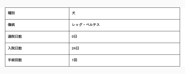 事例の犬のレッグ・ペルテスの通院日数、入院日数、手術回数について