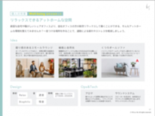 それぞれの要素を満たすエリアを導入するにあたって役に立つデザインや設備の知識、空間の体験を何倍にも広げてくれるテクノロジーのご紹介もします。