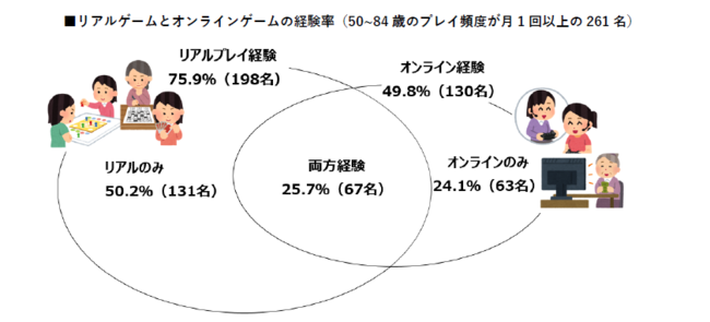 ⇒リアルプレイ「のみ」は50.2%(131名)、オンライン「のみ」は24.1%(63名)、リアル+オンライン両方の経験があるのは25.7%(67名)となっている。