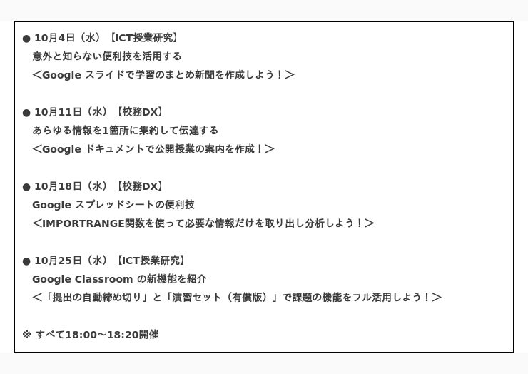 「ICT授業研究」や「校務DX」をテーマに、Google for Education の各種ツールの基本操作から、先生がいま知りたい最新トレンド情報まで、明日からすぐに使えるお役立ち情報をお伝えしています。