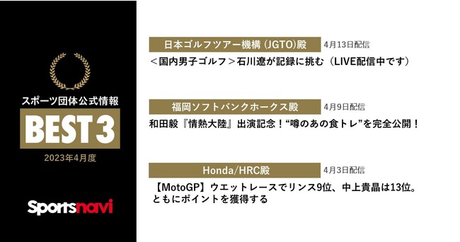 スポーツナビでは毎月、公式情報記事・動画配信において最も印象的だった記事・動画3つを選定し、「スポーツ団体公式記事・動画 月間ベスト3」と称して表彰させていただいております。