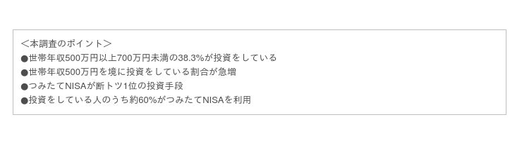 【投資の実態調査】世帯年収500万円以上700万円未満の約4割が投資 〜つみたてNISAが断トツ1位の投資手段〜