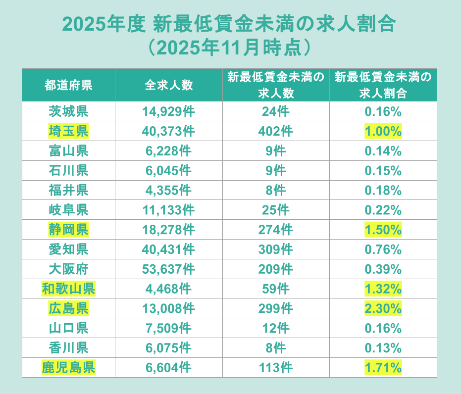 一方で、調査日が2025年11月3日であったことから、直近の11月1日に最低賃金が改定された埼玉県・静岡県・和歌山県・広島県・鹿児島県では、新最低賃金未満の求人割合がいずれも1%を超える結果となりました。一部の求人では、注釈として「10月以降は最低賃金以上に引き上げ予定」といった記載もありましたが、その他の求人では今後の内容の見直しが求められます。