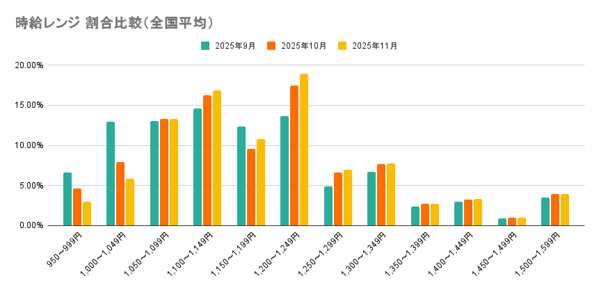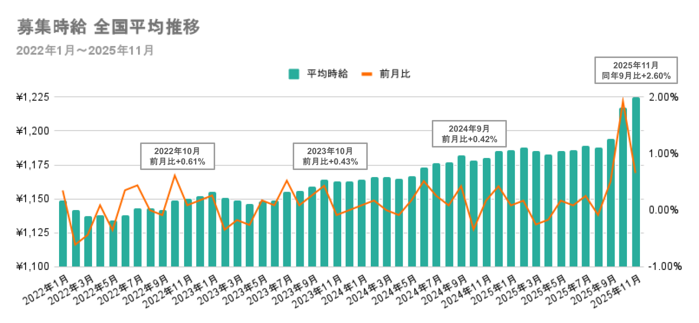 2025年11月の募集時給は全国平均で1,225円に。2ヶ月間で+2.60%上昇し、過去最大の水準に【2025年11月度 都道府県別 最低賃金改定後レポート】