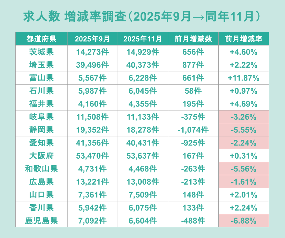 最後に、2025年9月から11月にかけての求人数の変動を確認します。全国的には増加傾向の自治体も見られますが、一部自治体では減少傾向も目立ちます。特に、73円の引き上げを行った鹿児島県では、求人数が前月比で6.88%減少し、最大の減少幅となりました。