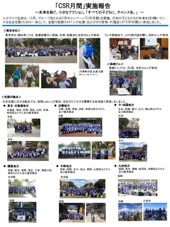 メットライフ生命保険株式会社(代表執行役 会長 社長 サシン・N・シャー)は、10月の1か月間、全世界のメットライフで初となる「CSR月間」を実施しました。全国で3,847人の社員およびその家族・代理店が、子どもや若者の支援*1を目的とするボランティア活動に参加しました。今後、この参加人数に応じて会社が合計3,847,000円を社会的養護下にある子どもたちの支援を行う特定非営利活動法人Living in Peace*2 (以下LIP)に寄付します。