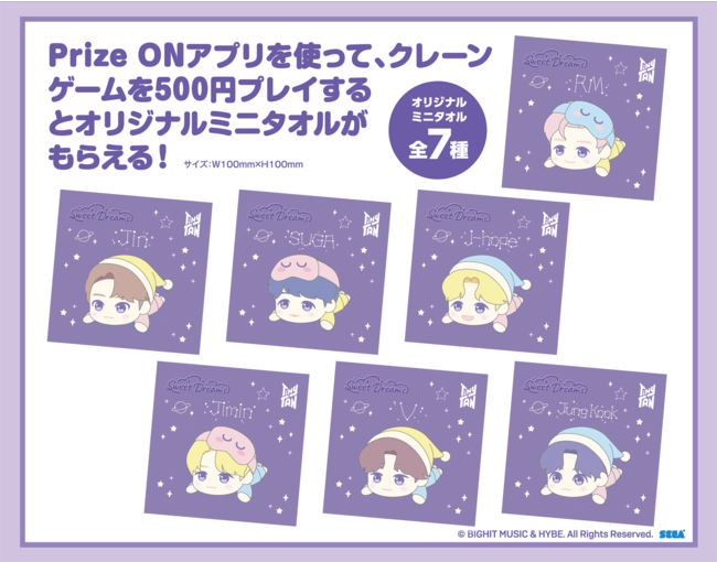 キャンペーンでは、キャンペーンポイント500ポイントごとに、BTSのキャラクター『TinyTAN -SweetDreams-』デザインのオリジナルミニタオル全7種より1点をプレゼントいたします。