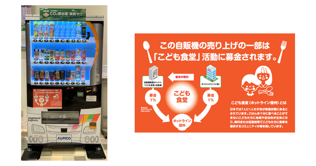 本自販機は、売上金の一部を長野県松本市に拠点を置く特定非営利活動法人NPOホットライン信州へ寄付し、同県内のこども食堂の活動に役立てられます。