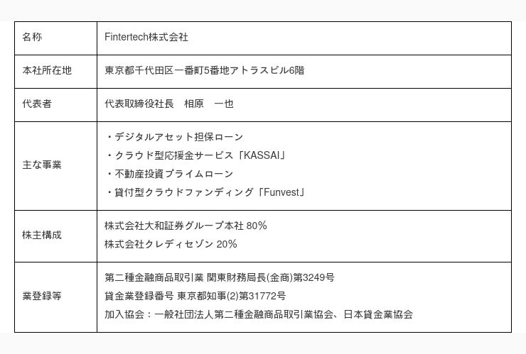 Fintertech は、大和証券グループ本社及びクレディセゾンがそれぞれ創業来培ってきた金融ビジネスのノウハウを礎としながら、最先端のテクノロジーの活用や外部企業との連携により次世代金融サービスを機動的にかつ柔軟に創出することを目指しています。暗号資産を活用した「デジタルアセット担保ローン事業」、クラウド型応援金サービスの「KASSAI事業」、投資目的で不動産を購入する際の資金を融資する「不動産投資プライムローン」を展開しています。