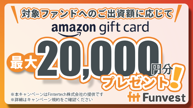 本ファンドへ出資していただいた投資家の皆様を対象として、出資額に応じて最大20,000円分のAmazonギフトカードをプレゼントするキャンペーンも併せて実施いたします。