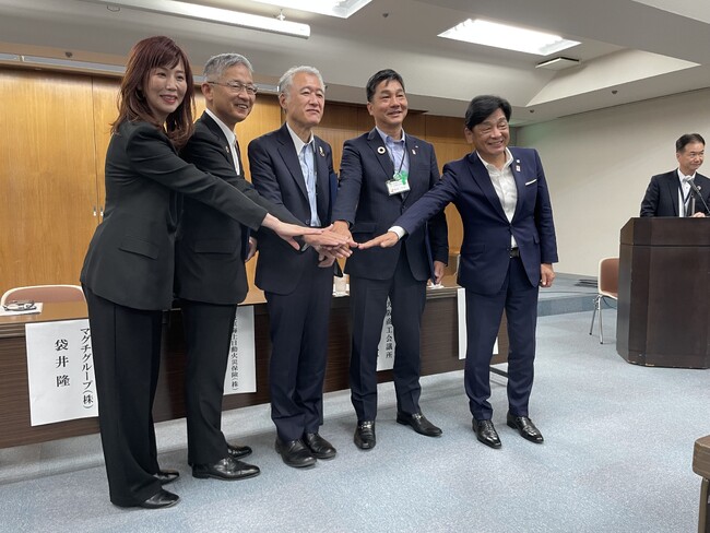 (左より当社代表、東京海上日動火災保険株式会社 常務執行役員 船橋直靖氏、大阪商工会議所 常務理事・事務局長 近藤博宣氏、大阪府 環境農林水産部長 原田行司氏、マグチグループ株式会社 代表取締役COO 袋井隆氏)