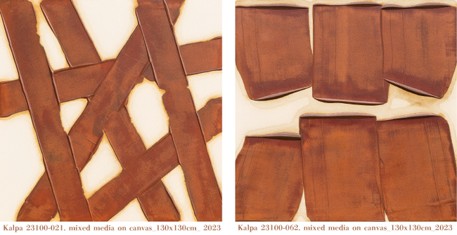 この「Kalpa(カルパ・劫)」シリーズはバランスを保っていた調和が、刹那のようにすれ違い、ついに消えてしまう過程を、メディウムと鉄粉を混ぜた赤褐色の絵の具を用いて、絵画の手法でキャンバス上に落とし込んだ作品で構成されています。イ・ギソンは鉄粉を錆びさせることで、作品に意味を込めます。 ここでの錆びは死を意味します。作品を鑑賞する我々は、キャンバスの中で真理を迎えることができます。イ・ギソンならではのシグネチャーシリーズです。