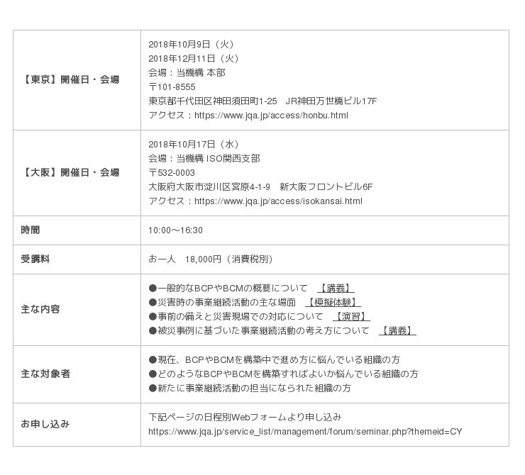 一般財団法人 日本品質保証機構(本部:東京都千代田区、理事長:小林 憲明)は、2018年10月以降に開催する「被災経験から学ぶ事業継続入門」セミナーについて、お客さまのご要望に応じてリニューアルし、演習や解説の時間を拡充いたしました。