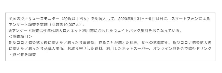 インターネット行動ログ分析によるマーケティング調査・コンサルティングサービスを提供する株式会社ヴァリューズ(本社:東京都港区、代表取締役社長:辻本 秀幸、以下「ヴァリューズ」)は、国内の20歳以上の男女10,007人を対象に、新型コロナウイルス感染拡大前後での食生活の変化や食に対する意識変化をアンケートにて調査しました。