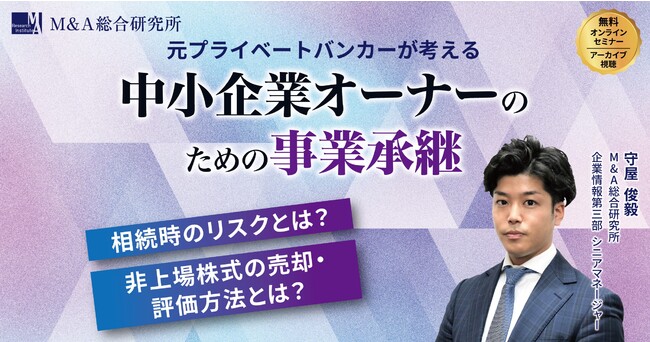 株式会社M&A総合研究所(本社:東京都千代田区、代表取締役社長:佐上 峻作、以下「当社」)は、中小企業オーナー向けの事業承継セミナーを実施し、アーカイブ視聴が可能になりましたのでお知らせいたします。
