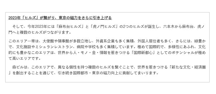 「国際都市間競争を勝ち抜き、世界から人・モノ・金・情報を惹きつけるためには 東京都心部における大規模都市再生が不可欠だ」「グローバルプレーヤーに選ばれる都市になるためには、経済だけでなく文化が重要だ」との考えから、街のコンセプトに「文化都心」を掲げ、オフィス、住宅、商業施設、美術館、映画館、放送センター、緑地など多様な都市機能を高度に複合させた「コンパクトシティ(都市の中の都市)」を創出しました。加えて、 街を一体的に運営する「タウンマネジメント」によって人々との絆を深め続けた結果、開業から約20年が経過した現在も年間約4,000万人が訪れており、昨年12月24日には過去最高となる33万人/日を記録しました。さらに、商業施設の年間売上げは2022年度に過去最高を記録。20年が経過しても色あせることなく、時間の経過と共にますます磁力を増していく、都市再生のモデル事業として、引き続き国際都市・東京の国際競争力強化に貢献してまいります。