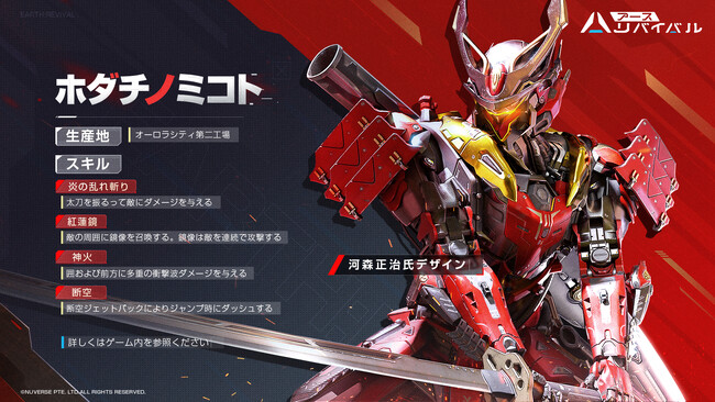 河森正治氏デザインの新バトルスーツが登場!赤いバトルスーツがすっくと立った姿は、まるで火の神のよう。火炎で世界のあらゆるものを焼き尽くす、連盟傘下のオーロラシティ第二工場の機動型バトルスーツです。「ホダチノミコト」という名前は戦闘中の特殊行動にちなんで名づけられました。背中の強大な太刀がトレードマークで、太刀攻撃時に発生する衝撃波は従来の機動型バトルスーツのリーチの短さを補っています。また、ホダチノミコトの機体設計はある程度敵の防御を貫通する能力を有し、防御力の高い敵に対しての攻撃効果も高いです。