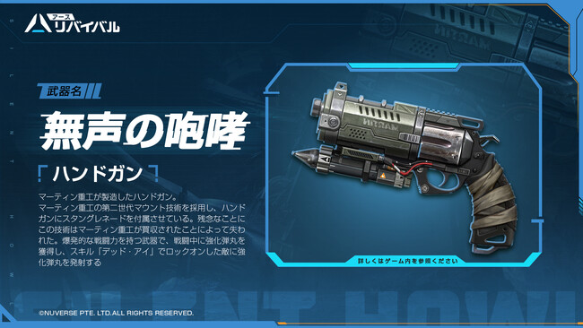 マーティン重工が製造したハンドガン。マーティン重工の第二世代マウント技術を採用し、ハンドガンにスタングレネードを付属させています。残念なことにこの技術はマーティン重工が買収されたことによって失われました。爆発的な戦闘力を持つ武器で、戦闘中に強化弾丸を獲得し、スキル「デッド・アイ」でロックオンした敵に強化弾丸を発射します。