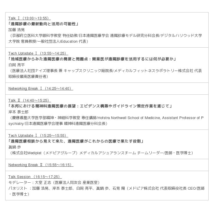 登壇者には、日本遠隔医療学会で遠隔診療モデル研究分科会長を務める加藤浩晃先生、同学会理事で精神科遠隔医療分科会長を務める岸本泰士郎先生、そして遠隔医療の現場で導入に取り組む医師として、医療法人社団ナイズの白岡亮平先生および弊社眞鍋歩を迎え、研究および臨床・ビジネスの立場から見る遠隔医療をお話いただきます。また、毎回質問が途切れず盛り上がりを見せるトークセッションは時間を大幅に拡大。産業医の大室正志先生をモデレーターに、参加者も交えて会場参加型で議論を深めます。
