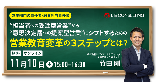 クライアントの売上向上を強みとする株式会社リブ・コンサルティング(本社:東京都千代田区、代表取締役:関厳)は、営業教育責任者・人事担当者向けに、営業組織を意思決定層への提案型営業にシフトするための3ステップを解説する「営業教育改革」セミナーを2022年11月10日(木)にオンライン開催します。