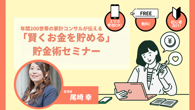 当日は、年間200世帯のマネープランを担当、オンラインをメインに全国の20代〜40代のご夫婦に家計相談・お金の基礎知識・ライフプランをご提案している、講師の尾崎幸様を迎えて「年間200世帯の家計コンサルが伝える”賢くお金を貯める”貯金術」に関するオンラインセミナーを実施いたしました。