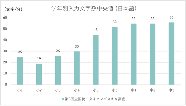 第3回のスキル調査では小学6年生と中学全学年で、1分間あたりの日本語の正しい入力文字数が50文字以上との結果が得られました。