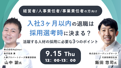 9/15(木)【優秀層の中途採用と人材定着セミナー】『入社3ヶ月以内の退職は、採用選考時に決まる?活躍する人材の採用に必要な3つのポイント』を開催!