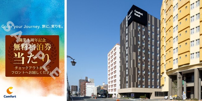 「コンフォートホテル名古屋新幹線口」(以下、当ホテル)はJR名古屋駅太閤通口より徒歩約5分の場所に位置する、ビジネスや観光の拠点として便利なホテルです。2022年11月1日(火)に開業3周年を迎えました。これまでの感謝の気持ちをこめて、3周年にちなみ、3ヶ月連続で毎月3名様に無料宿泊クーポンが当たるキャンペーンを開催します。