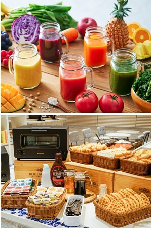毎朝6時30分からComfort Library Cafeで朝食を無料で提供しています。おすすめは、こうじや大豆飲料を使った「カラダの中から整えるスムージー」、地産地消の食材を使った「赤だし味噌汁」。バルミューダのトースターで焼き上げるパンも人気を集めています。