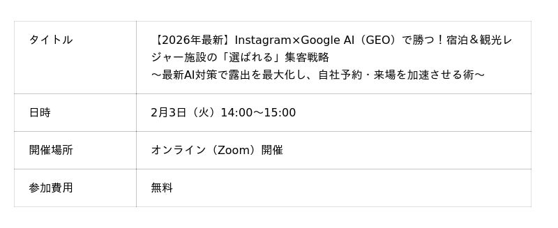 2月3日(火)14:00より、Instagram×Google AI(GEO)で勝つ!宿泊&観光レジャー施設の「選ばれる」集客戦略 〜最新AI対策で露出を最大化し、自社予約・来場を加速させる術〜を開催