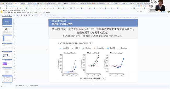 上のグラフな何かと申しますと、横軸が計算量。事前にAIに学習した学習量とお考えください。縦軸がAIの精度になるんですけれども、ある時を境に急激にAIの精度が伸びておりまして、ここ最近になって急激にこのチャットボットの精度というのが上がってきております。なので、一昔前の違和感を覚えるような「何か変な答え返ってくるぞ」みたいな回答を感じになられた方も、ぜひ触ってみていただいて、「これぐらいの精度が出るんだ」というのを実感してみていただけたらと思います。〜〜〜