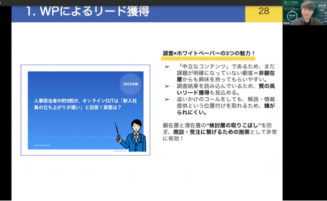 まずはホワイトペーパーによるリード獲得ですね。ホワイトペーパーをダウンロードする背景として「調査結果」を知りたい方は多いと思います。調査の性質上、中立的なコンテンツになっていまして、まだ課題が明確になっていない顧客、いわゆる非顕在層マーケティングファネルにおける準顕在層や潜在層からも興味を持ってもらいやすいという性質がございます。