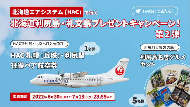 クリプトン・フューチャー・メディア株式会社(本社:北海道札幌市、代表取締役:伊藤博之、以下クリプトン)では、北海道エアシステム株式会社(以下HAC)・利尻富士町・利尻町・礼文町と連携し、2022年6月〜10月にかけて「HACで行く北海道利尻島・礼文島プレゼントキャンペーン」を実施しております。期間中は毎月、HAC札幌(丘珠)・利尻間の往復ペア航空券やご当地品が当たるキャンペーンを、『Domingo』公式Twitter(https://twitter.com/cfm_domingo)にて開催。第2弾は6月30日(木)スタートですので、ぜひご参加ください。