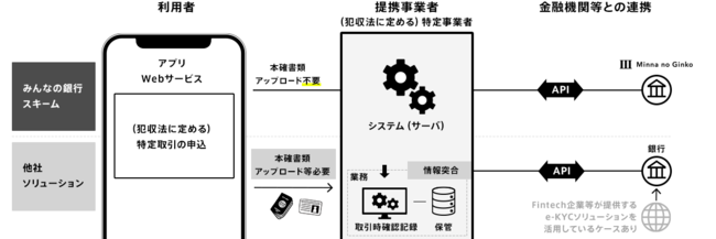 ・ 犯罪収益移転防止法(以下、「犯収法」)に定める保険契約の申込み等の「特定取引」にあたり、提携事業者が利用者の本人確認書類をアプリでアップロードする等により直接取得することなく、当行の本人確認済情報提供APIで得られる情報を用いて、提携事業者が取引時確認を行うものです。これにより犯収法における、取引時確認のデジタル完結を新たな形態でサポートすることが可能になります。