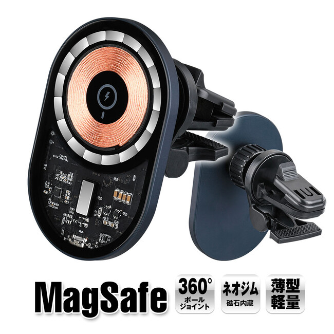 MagSafe対応iPhoneをマグネットで保持できる、エアコンルーバー取り付けタイプの車載ホルダー