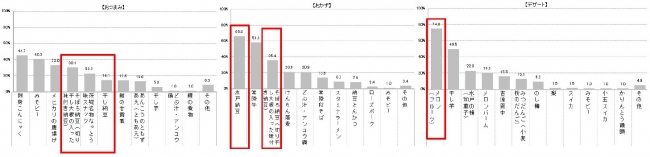 「おつまみ」部門では、4位に「そぼろ納豆(切り干し大根の入った味付き納豆)」(30.1%)、5位「茨城名物なっとう味スナック」(22.3%)、6位「干し納豆」(14.1%)がランクイン。さらに「おかず」部門では、1位「水戸納豆」(66.0%)、3位「そぼろ納豆」(35.4%)がランクインするなど、「おつまみ」・「おかず」部門ともに“納豆”の人気が伺えました。「デザート」部門では、「メロン(フルーツ)」が約75%(74.8%)の支持を得ており、2位の「干し芋」(49.5%)と25ポイント以上の差をつけて1位になりました。