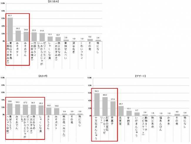 「おつまみ」部門では、「東松山やき鳥(豚肉+辛みそ)」が62.1%で、2位と30ポイント以上の得票差をつけて堂々の1位。また、2位に「みそポテト」(28.2%)、3位「みそおでん」(24.8%)が続き、トップ3は“みそ”を使った料理が人気でした。「おかず」部門トップ5では、「煮ぼうとう(しょうゆ味)」(30.6%)、「みそおでん」(28.2%)、「ゼリーフライ(おからとじゃがいも)」(27.2%)、「秩父おなめ(おかずみそ)」(26.7%)、「しゃくしな漬」(25.2%)が肩を並べました。「デザート」部門では、「十万石まんじゅう」(59.2%)、「彩果の宝石(フルーツゼリー)」(49.0%)、「芋菓子」(37.9%)が上位にランクインしました。