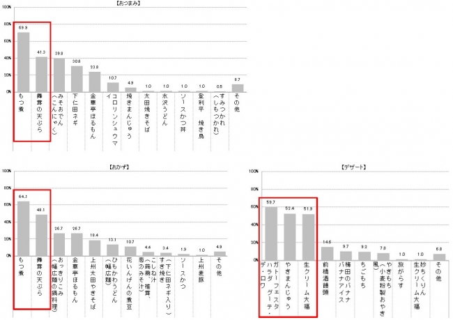 「おつまみ」、「おかず」部門ともに、1位に「もつ煮」(おつまみ:69.9%、おかず:64.1%)、2位に「舞茸の天ぷら」(おつまみ:41.3%、おかず48.1%)がランクインし、名産品としての人気の高さを証明しました。また「デザート」部門では、都内の百貨店でも行列を作るほど大人気のラスク「ガトーフェスタ ハラダ グーテ・デ・ロワ」(59.7%)が1位に輝いたほか、2位「やきまんじゅう」(52.4%)、3位「生クリーム大福」(51.9%)が、4位以下と約40ポイント差をつけて高い支持を得ました。