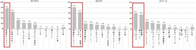 「おつまみ」・「おかず」部門、どちらも「崎陽軒のシウマイ」が1位を獲得(おつまみ:76.7%、おかず:81.6%)し、圧倒的な人気を誇りました。また「おかず」では、1位の「崎陽軒のシウマイ」と2位の「生しらす・釜揚げしらす」(63.6%)が、3位以下と40ポイント以上もの得票差をつけてトップ2にランクイン。「デザート」部門でも、1位「ありあけのハーバー」(59.2%)と2位「豊島屋 鳩サブレー」(54.4%)が半数以上に支持され、3位以下と20ポイント以上の差をつけるなど、各部門とも上位・下位の差が際立つ結果となりました。