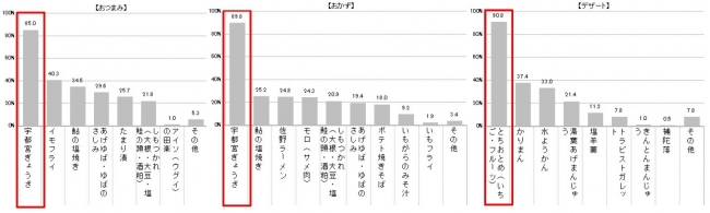 「おつまみ」、「おかず」ともに1位に輝いたのは、「宇都宮ぎょうざ」(おつまみ:85.0%、おかず:89.8%)で、「おつまみ」部門では2位「イモフライ」(40.3%)と約45ポイント差、「おかず」部門では「鮎の塩焼き」(25.2%)と、約65ポイントもの差をつけて堂々の1位に選ばれました。また「デザート」部門では9割以上の人が「とちおとめ(いちご・フルーツ)」(90.8%)を選び、圧倒的な人気を誇りました。