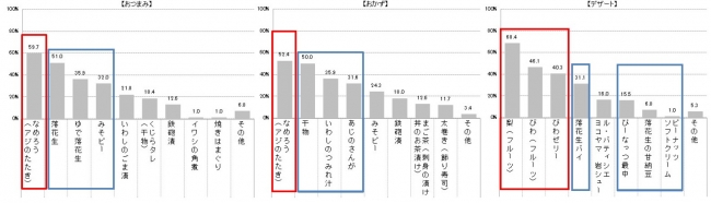 「なめろう(アジのたたき)」が、「おつまみ」、「おかず」の両部門で1位にランクイン(おつまみ:59.7%、おかず:52.4%)。さらに「おつまみ」では、2位「落花生」(51.0%)、3位「ゆで落花生」(35.9%)、4位「みそピー」(32.0%)が続き、“落花生”がおつまみとして絶大な支持を得ました。また「おかず」では、1位「なめろう」に次いで、2位「干物」(50.0%)、3位「いわしのつみれ汁」(35.9%)、4位「あじのさんが」(31.6%)が続くなど、海に面する千葉県ならではの海産物が上位にランクイン。「デザート」部門では、1位「梨(フルーツ)」(68.4%)、2位「びわ(フルーツ)」(46.1%)、3位「びわゼリー」(40.3%)など、果物系がトップ3にランクイン。さらに注目すべきは、4位に「落花生パイ」(31.1%)、6位「ぴーなっつ最中」(15.5%)、7位「落花生の甘納豆」(6.8%)、8位「ピーナッツソフトクリーム」(1.0%)が入るなど、ここでも“落花生”人気が伺える結果となりました。