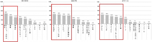 「おつまみ」部門では、「もんじゃ・お好み焼き」(48.5%)が1位。次いで、「佃煮」(36.9%)、「卵焼き」(31.6%)と“下町の味”や“江戸時代から愛される味”として人気の名産品が並びました。また「おかず」部門では、「すき焼き」(45.6%)、「てんぷら/天丼」(44.2%)、「とんかつ」(39.8%)、「うなぎの蒲焼き」(39.3%)がほぼ横並びの得票率で支持されました。「デザート」部門では、上位5位に「くずもち」(42.2%)、「たいやき」(40.3%)、「芋ようかん」(34.5%)、「みつまめ/あんみつ」(31.6%)、「豆大福」(27.7%)が並び、古くから愛される甘味が上位にランクインしました。