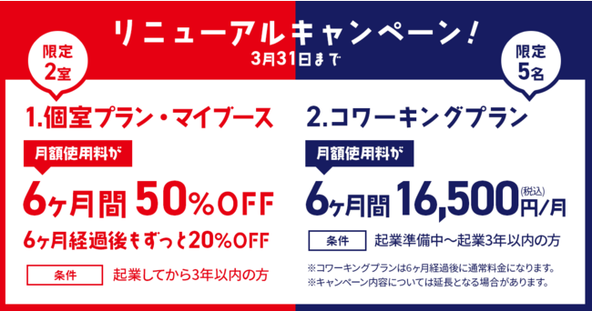 コワーキングの月額使用料が6ヶ月間 16,500円(税込)/月に割引。(通常料金:29,700円/月)