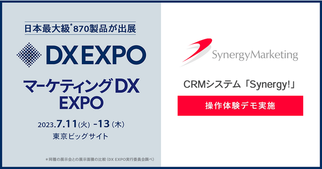 シナジーマーケティング株式会社(所在地:大阪市北区、代表:田代 正雄、以下当社)は、2023年7月11日(火)〜7月13日(木)に開催される「DX EXPO 2023 夏 東京」にブース出展します。当社ブースは「DX EXPO 2023 夏 東京」を構成する専門展のひとつ「マーケティングDX EXPO」に出展し、当社クラウド型CRMシステム「Synergy!(読み方:シナジー)」の操作体験デモを中心に、幅広い業種と多くの企業を知る専門家たちがデジタルマーケティングに関するご相談をお受けします。