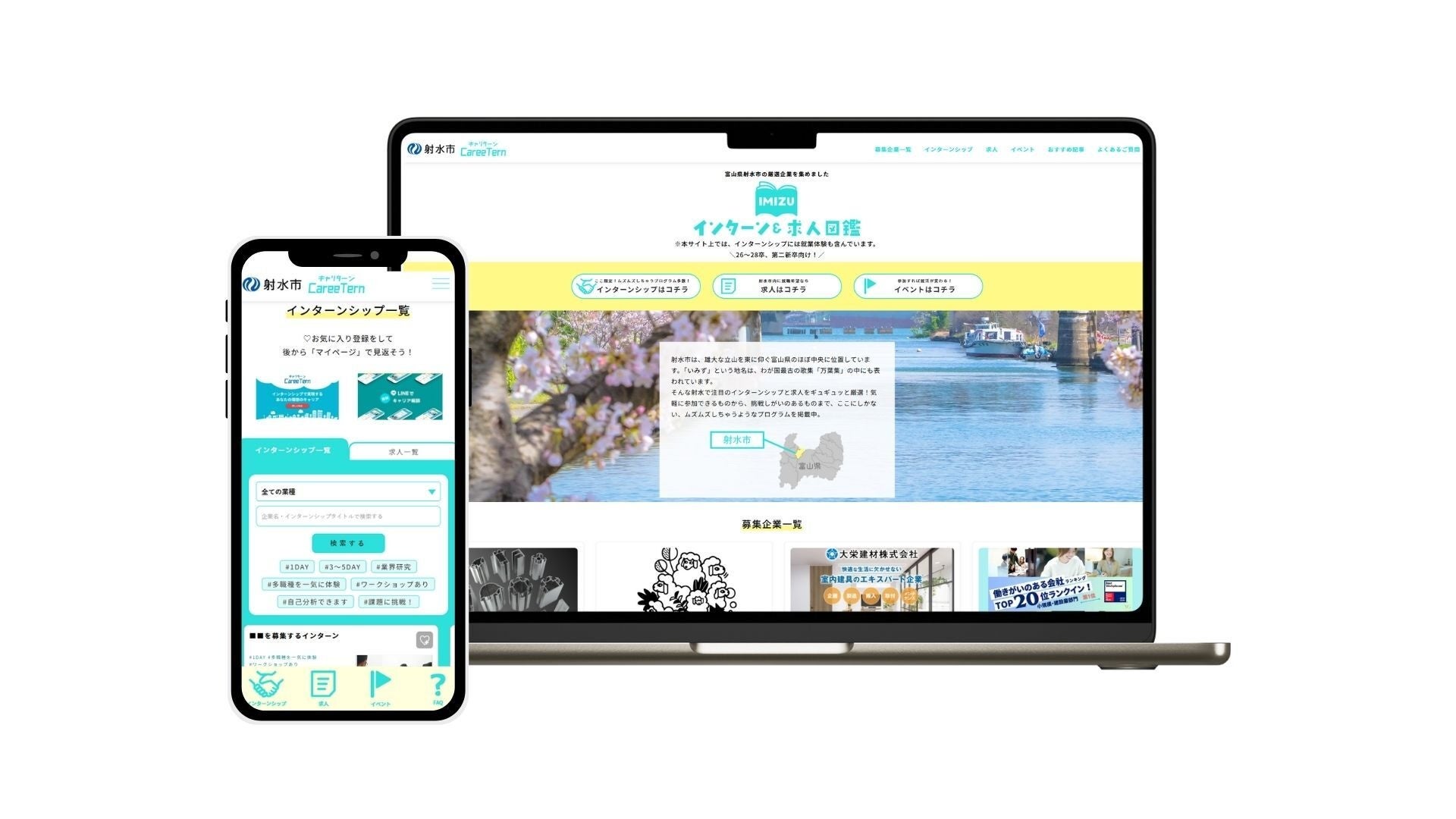 富山県射水市では、学生向けインターンシップや求人情報を集めた特設サイト「IMIZU インターン&求人図鑑」を、インターンシップマッチングサービス「CareeTern(キャリターン)」内にオープンしました(受託運営:株式会社Asian Bridge)。