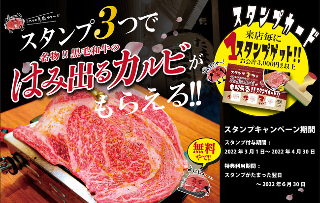 スタンプ付与期間中に、スタンプカードに3つスタンプをゲットしコンプリートすると、創業当時からの大人気メニュー「名物!!黒毛和牛のはみ出るカルビ」を1枚無料でプレゼントします!スタンプカードは枚数限定で、なくなり次第配布終了いたしますので、お早めのご来店をお待ちいたしております。「大阪焼肉・ホルモン ふたご」全店舗(ふたごデリを除く)で開催中!