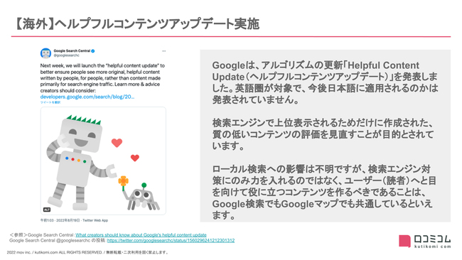 お客様の声のDXサービス「口コミコム」を運営する株式会社mov(代表取締役:渡邊 誠、本社:東京都渋谷区、以下mov)は、Googleマップ・Googleビジネスプロフィール(Googleマイビジネス)、Google検索の更新情報や、口コミマーケティングノウハウなどの最新ニュースをまとめた「MEO・口コミマーケまとめ【2022年8月版】」を公開しました。