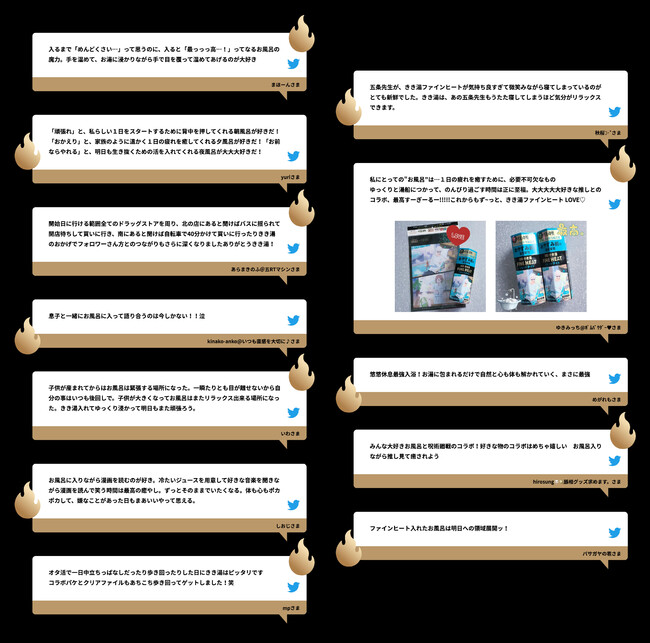 このたび、「#みんなの全力風呂愛」「#きき湯ファインヒート」というハッシュタグとともに、「ご自身のお風呂に対する愛のコメント」を投稿すると、コラボグッズが当たる「#みんなの全力風呂愛 投稿キャンペーン」を開催。結果、3,255件の“お風呂愛”が集まりました。1日の疲れを癒すだけでなく、オンオフの切り替えが難しくなりつつあるwithコロナ時代だからこそ、浴後のオフタイムを楽しむ投稿が多くみられたほか、好きなことや「推し」とともに癒しのバスタイムを過ごす声も多数いただきました。本キャンペーンにご参加いただいた皆様、誠にありがとうございました。投稿いただいた“お風呂愛”の中から、特にお風呂への愛が強い「特級お風呂愛」12選を発表します。