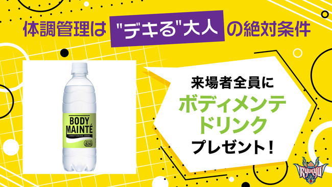 来場者全員に大塚製薬様よりボディメンテドリンクをプレゼント!ボディーメンテドリンクを飲んで、コンディショニングが整った”デキる”大人を目指しましょう。お帰りの際に退場口付近にてお受け取りください。