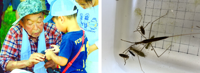 教室当日は、伊達生物調査事務所の伊達功所長の指導のもと、水生昆虫を捕獲するためのトラップを一緒に設置、一定時間置いた後にトラップを引き上げ、ビオトープに生息する昆虫を確認しました。トラップには、主にゲンゴロウなどの肉食の水生昆虫が確認され、子供たちから大きな歓声があがりました。また、トラップ以外にもスタッフや自分たちで捕獲した様々な昆虫に、子供たちは興奮しながらも、伊達所長が特徴や生態などの説明を話し始めると真剣に聞き入る姿も見られました。